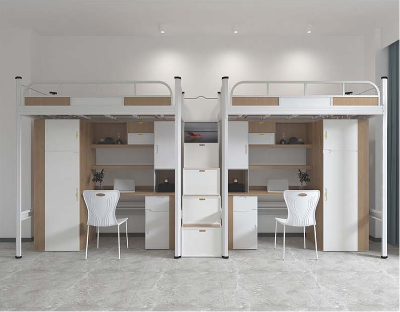 公寓床通常由床、?書柜、?衣柜、?書桌和梯架組成,?這種設(shè)計(jì)是為了適應(yīng)學(xué)生公寓或小型居住空間,?通過合理的空間利用,?提供集學(xué)習(xí)、?休息、?儲(chǔ)物于一體的多功能家具解決方案。?公寓床的設(shè)計(jì)注重實(shí)用性和空間的有效利用,?常常出現(xiàn)在學(xué)生公寓或共享住宿環(huán)境中。?
