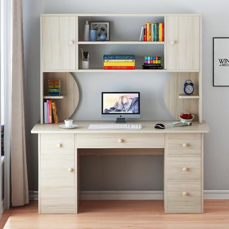 分層收納系統(tǒng):上層開放式格架可陳列書籍、裝飾畫,兩側(cè)封閉柜能收納文具、資料;中層圓弧置物區(qū)方便隨手取放常用物品;下層抽屜與柜體滿足隱私物品、大件文具的收納需求,讓桌面永遠(yuǎn)整潔有序。